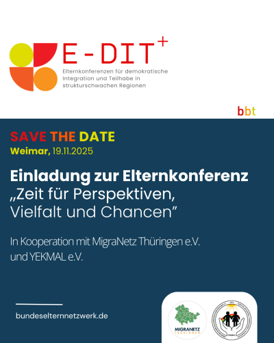 Das E-DIT PLUS Team freut sich über Ihre Teilnahme.Jetzt hier anmelden! Schauen Sie sich hier unser Programm an: Einladungsprogramm Elternkonferenz Weimar